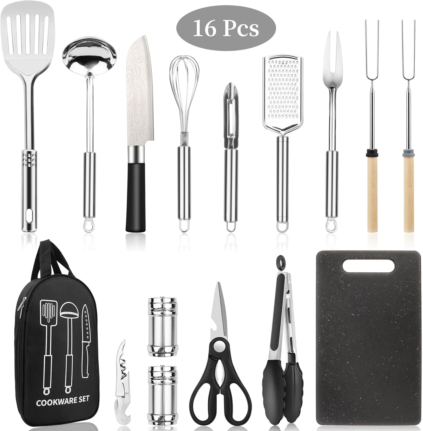 Camping Cooking Utensils Set, Stainless Steel Grill Tools, Camping BBQ Cookware Gear and Equipment for Travel Tenting RV Van Picnic Portable Kitchen Essentials Accessories(US)