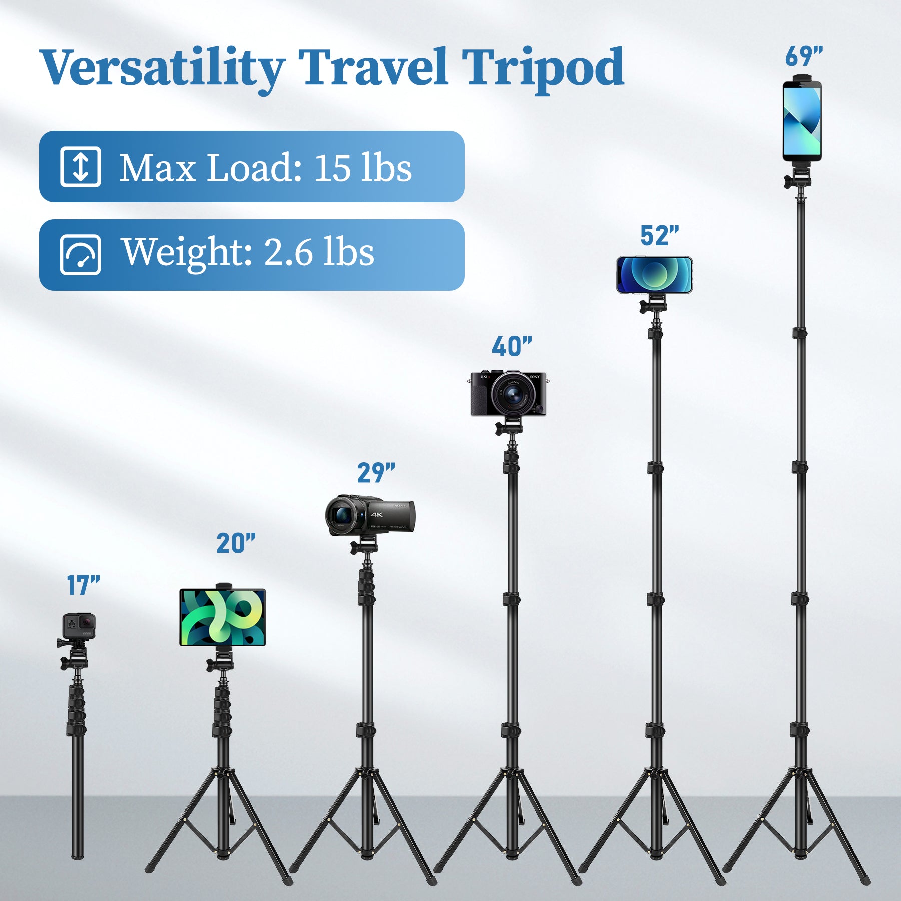 【Versatility Travel Tripod】 This portable tripod ( only 17" & 1 lbs when collapsed) is easy to store and carry in your backpack or bag. Perfect for selfies, group photos, travel, vlogging, YouTube videos, podcasts, Facebook Live, FaceTime, Instagram, live streaming, watching TV, meeting. Suitable for recording life, family gatherings and friends reunions, trips, hiking, camping, parties, sports activities, snowboarding, skiing, surfing, snorkeling, no matter indoor or outdoor activities.